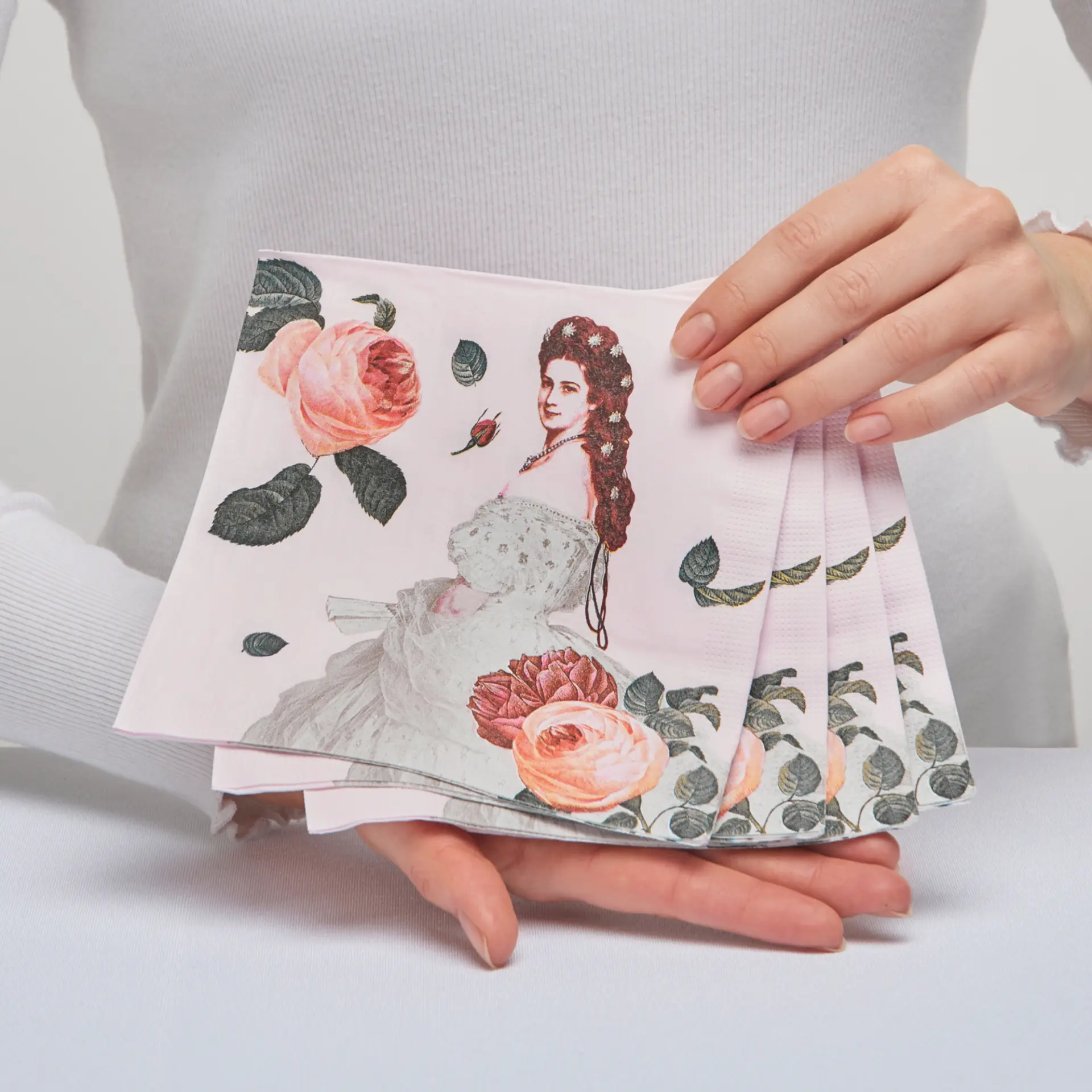 Diese Servietten bringen Stil auf jeden Tisch. Ihr edles Rosendesign erinnert an die Eleganz der höfisch gedeckten Tafeln zu Zeiten Kaiserin Elisabeths. Sie verbinden Funktionalität und feines Stilgefühl für den alltäglichen Gebrauch dank hochwertigen Drucks auf saugfähigem Papier.