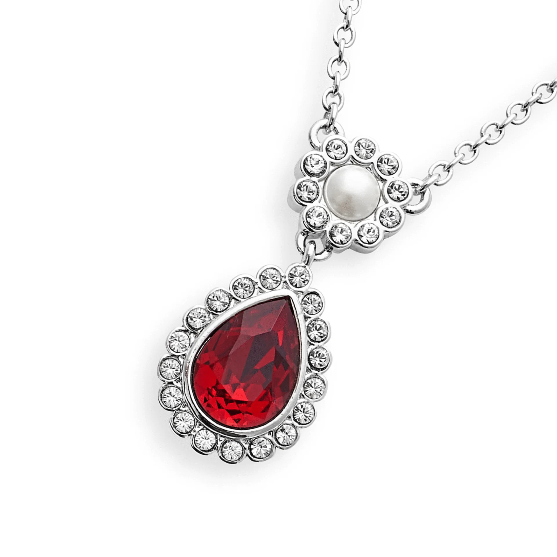 Kette mit Blume und Tropfen aus rotem Zirkonia Kristall mit einem Durchmesser von 1,2 cm ; Blume bestehend aus kleiner Kunstperle und 10 kleinen Zirkonia Kristallen; Durchmesser der Kunstperle: 0,5 cm; Durchmesser der Blume: 1 cm; Länge der Kette: 41,5 bis 46,5 cm; längenverstellbar; Material: rhodinierte Schmuckmetalllegierung; nickel- und allergiefrei